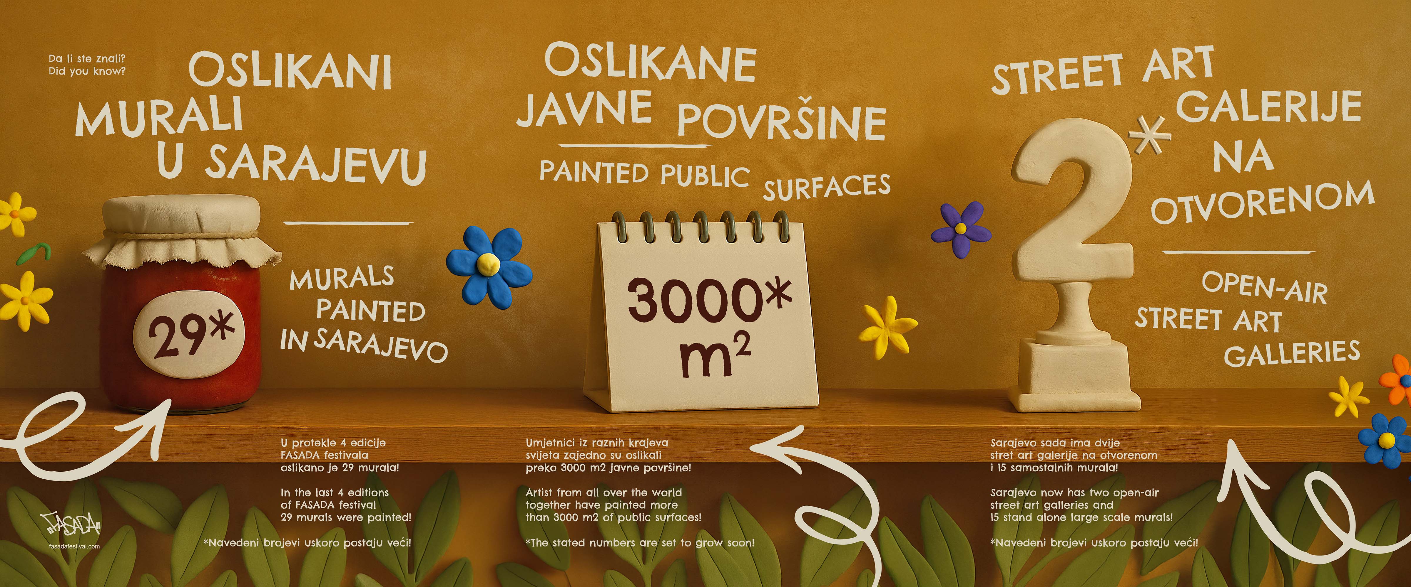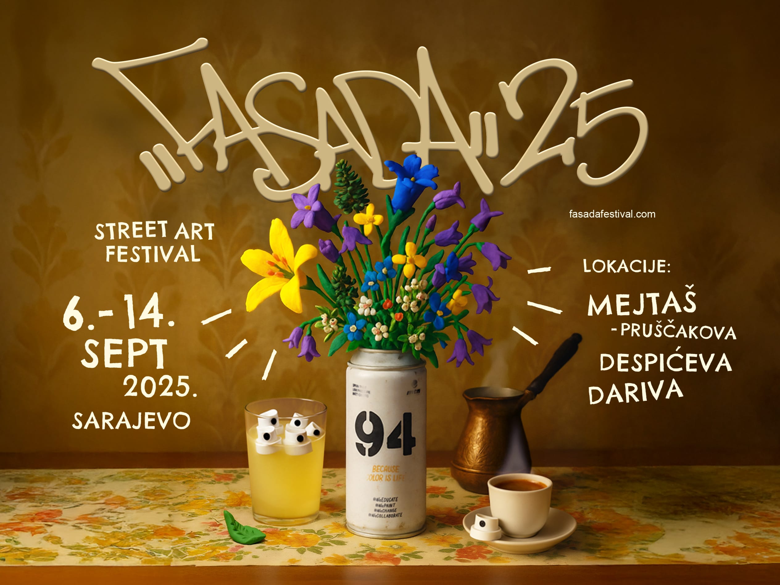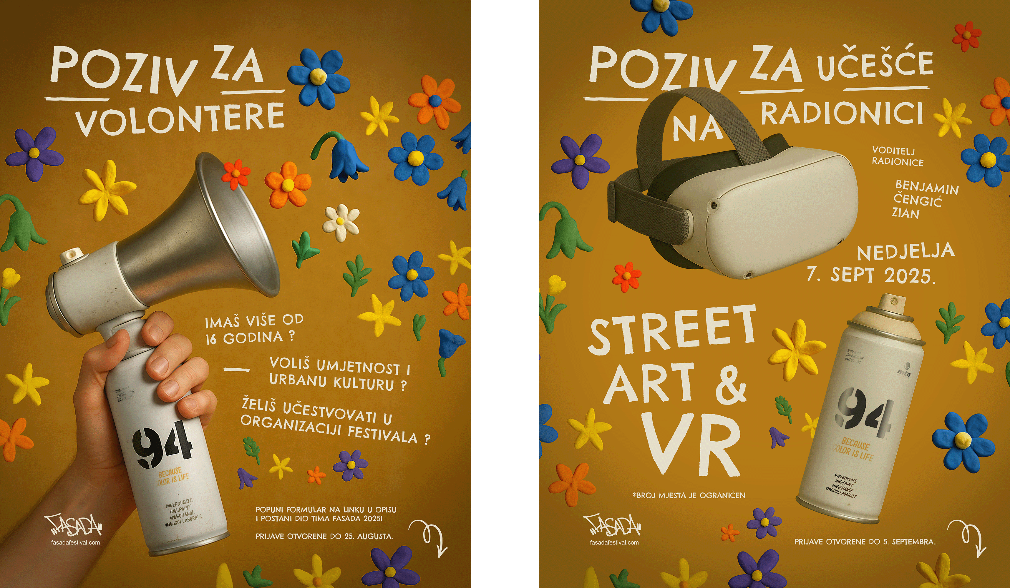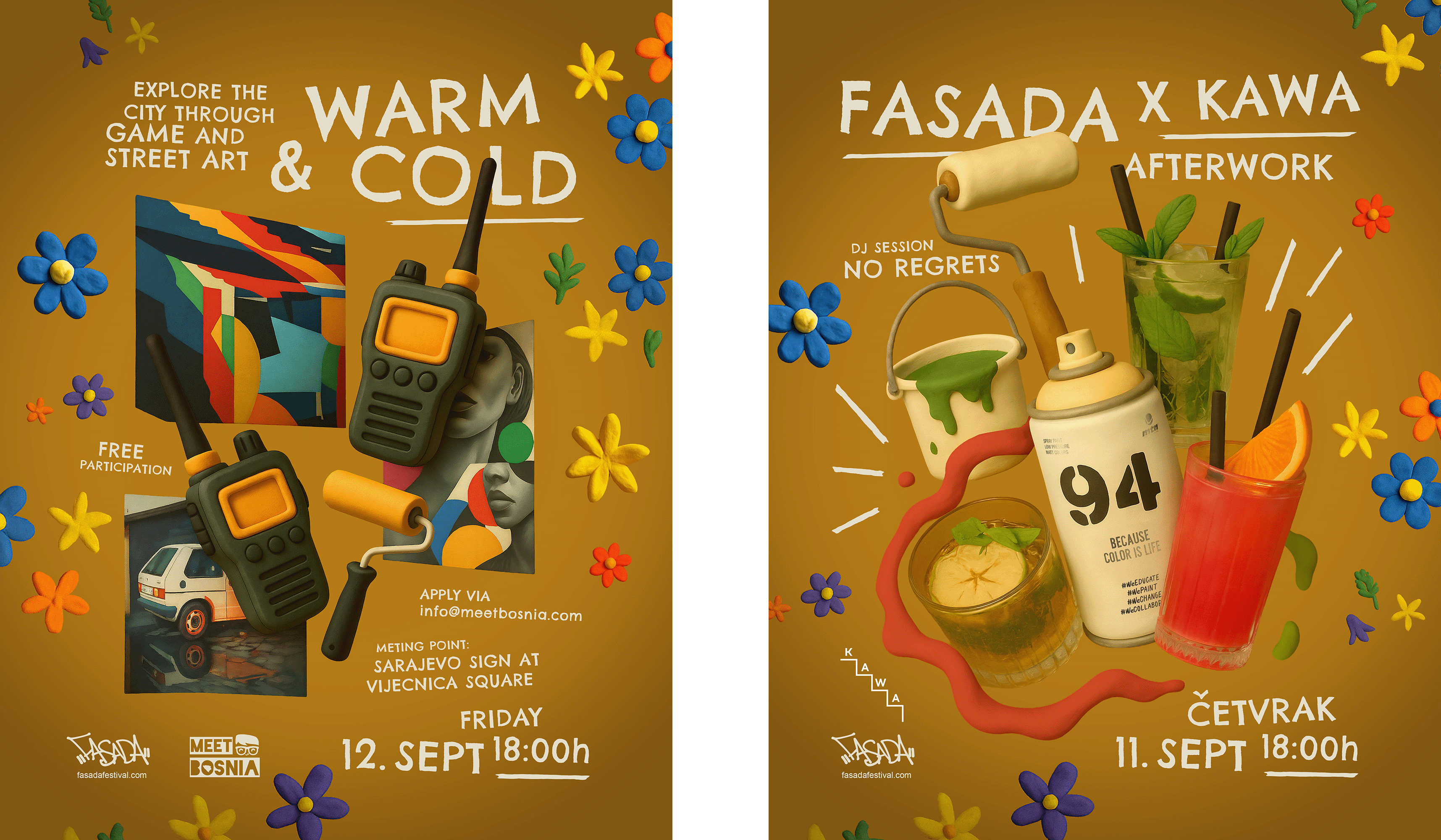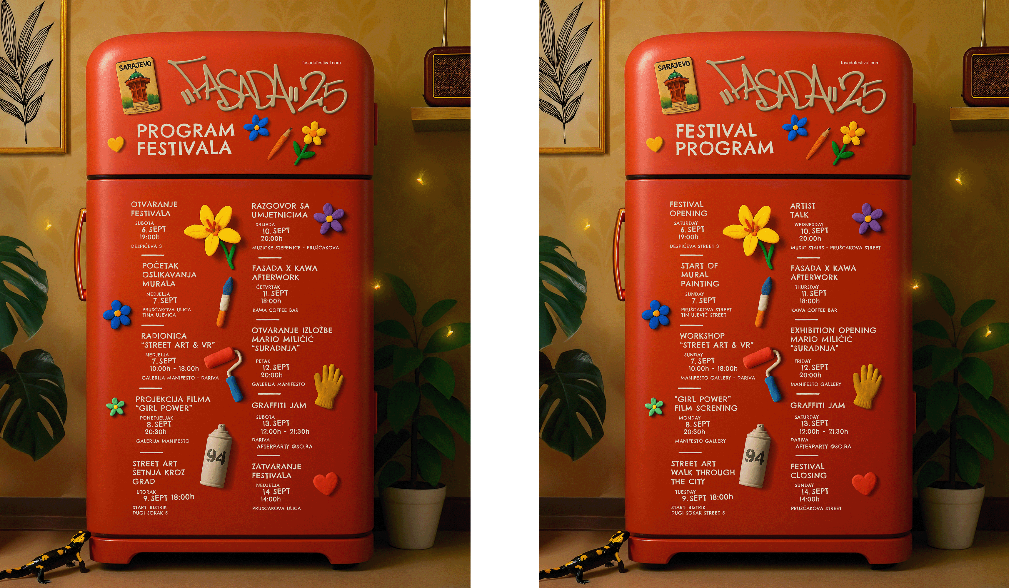 To anchor the visuals in Sarajevo, we imagined a classic Yugo-Balkan apartment. Specifically, one in the Mejtaš neighborhood—the actual location of all 2025 murals. The visual universe includes warm wallpaper, floral tablecloths, vintage furniture, and household objects familiar across former Yugoslav homes. From that single iconic image—the spray-can flower vase placed in a cozy Mejtaš kitchen-living room—the identity expanded into posters, billboards, teaser videos, flyers, and numerous digital assets. We even introduced additional objects such as a red refrigerator for program announcements, vintage TVs, megaphones, cocktails, walkie-talkies, volunteers, artists, and characters from the festival narrative.